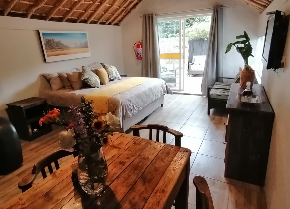 The Cottage is open plan with a king size bed, dining table and a fully equipped kitchen for self-catering with a stove and oven, fridge and small freezer, microwave, toaster and kettle. The bathroom has a shower, hand basin and toilet. Towels are provided. The Cottage has a flat screen television with full DSTV and there is free Wifi available for the duration of your stay.